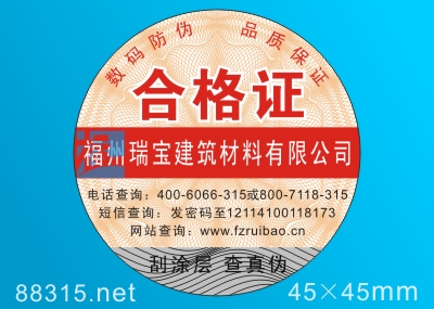 防偽合格證可以使用普通不干膠紙、銅版紙,也可以使用特殊防偽紙張,如纖維紙、安全線紙、水印紙、塑膜材料等,在合格證表面可以使用激光全息防偽膜增強(qiáng)防偽性能。