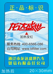 在防偽標簽印刷制作過程中,通過絲印將溫變熱敏油墨印在指定的標簽上,從而實現(xiàn)其防偽功能。樣標如下: