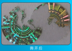 激光標所用的材料主要是鍍鋁膜,根據加工工藝不同,又有一次性使用的和永久性的膜。所謂一次性即撕開標簽表面后,標簽就會被破壞,不能重復使用(如上圖所示);而永久性即撕開標簽后,標簽完好。除了常用的鍍鋁膜還有介質膜、VOID專用膜、燙印膜等等。