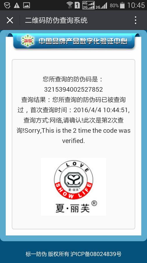 可變二維碼即每個(gè)標(biāo)簽上的二維碼都是不一樣的,不重復(fù),只能一次查詢有效等特性,其查詢結(jié)果的頁(yè)面有兩種情況,一是用我公司提供的標(biāo)準(zhǔn)化通用型的頁(yè)面,二是通過(guò)定型個(gè)性化的查詢結(jié)果頁(yè)面。以下主要介紹有關(guān)通用型的案例及相關(guān)過(guò)程結(jié)果。
