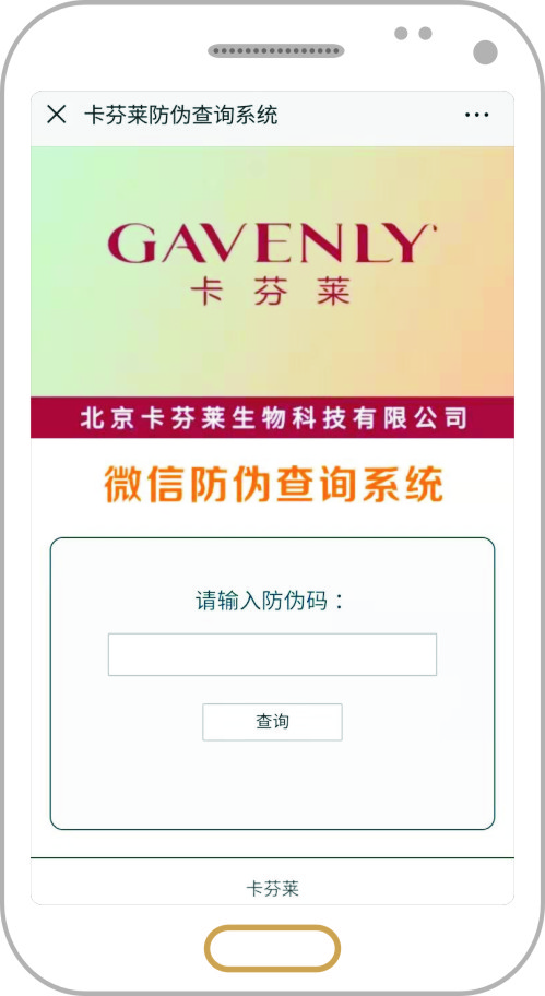 開啟微信掃一掃功能,掃描標簽上的微信二維碼,點擊關注,而進入相應的公眾號平臺,在操作菜單中選擇相應的防偽查詢,點擊進入可實現防偽查詢,消費者同時也可以關注微信號更多信息,商家也可以通過平臺進行相關管理,如定期抽獎等。